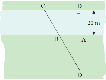 A, B, C and D are posts on the banks of a 20 m wide canal. A and B are 1 m apart. If OA = CD, find how far C and D are apart.