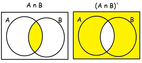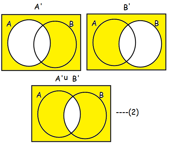 Verify (A n B)' = A' U B' using Venn diagrams.