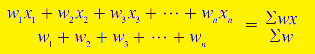 = (w1x1 + w2x2 +.......+ wnxn) / (w1 + w2 +.......wn)
