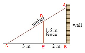 A piece of timber leaning against a wall, just touches the top of a fence, as shown. Find how far up the wall the timber reaches.
