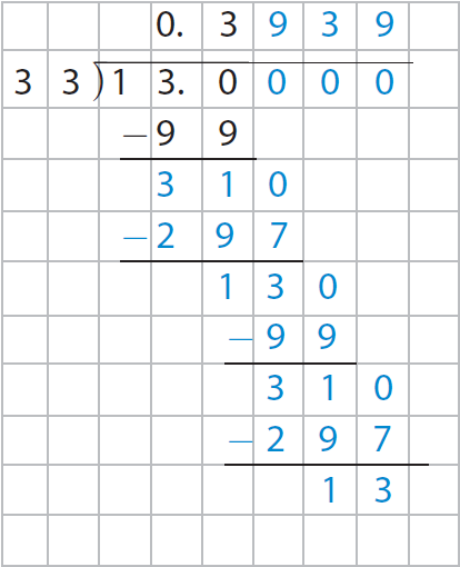 In 130, there are three 33's which is 99. So, subtract 99 from 130. Use the grid to help you complete the long division.